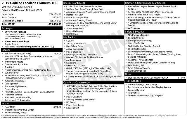Elevate your driving experience with this stunning 2019 Cadillac Escalade Platinum Edition. This luxurious SUV boasts a captivating Red Passion Tintcoat exterior, complemented by a host of premium features that will elevate your every journey.
