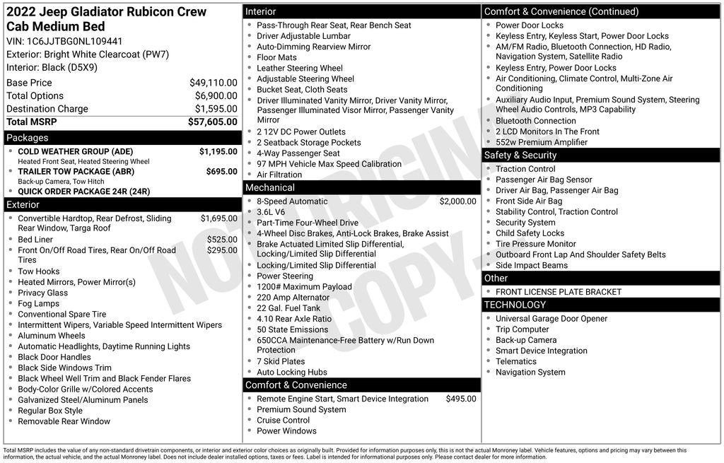 Beyond these standout amenities, the Gladiator Rubicon boasts a robust 3.6L V6 engine paired with an 8-speed automatic transmission, delivering exceptional 4WD capability and an EPA-estimated 22 MPG highway. The performance-tuned suspension and all-terrain tires ensure a confident, capable ride, whether you're navigating rugged trails or cruising down the highway.