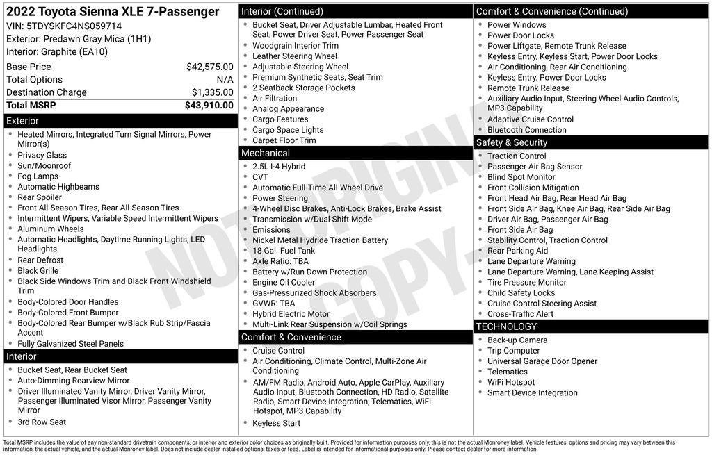 Elevate your driving experience with this exceptional 2022 Toyota Sienna XLE 7 Passenger. Boasting a sleek gray exterior and a sophisticated hybrid powertrain, this versatile minivan is the perfect blend of style, efficiency, and capability.