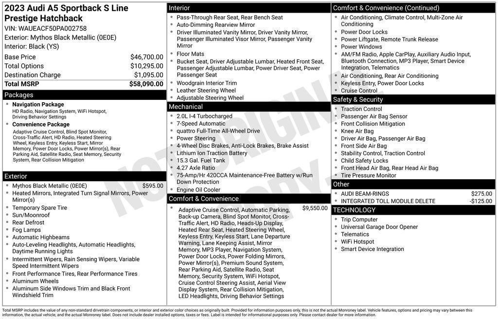 Experience the epitome of German engineering and luxury with this stunning 2023 Audi A5 Sportback 45 S line Prestige quattro. This meticulously maintained vehicle boasts a captivating Mythos Black Metallic exterior, perfectly complemented by its sleek and sophisticated design.