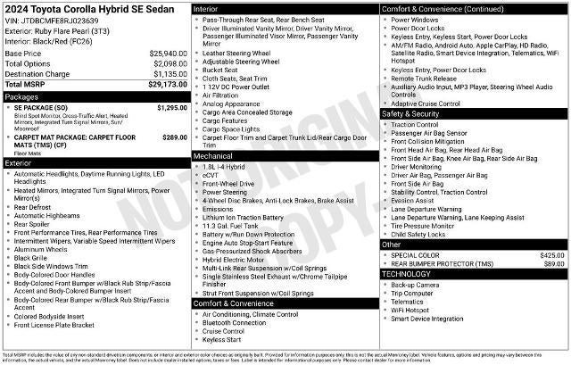 Introducing the 2024 Toyota Corolla Hybrid SE, a compact car that seamlessly blends efficiency, style, and advanced technology. With its striking Red exterior, this Corolla Hybrid SE is more than just a practical commuter it's a statement of your commitment to sustainable driving.