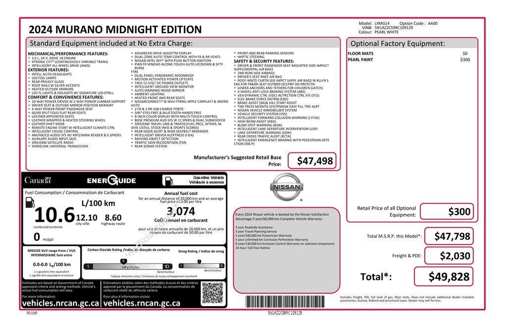 Equipped with a powerful 3.5L V6 DOHC 24V engine and Xtronic CVT with AWD, the Murano SL Midnight Edition offers exceptional power and efficiency, with an impressive 20 city/28 highway MPG. Its sleek, modern exterior in White is complemented by premium features such as: